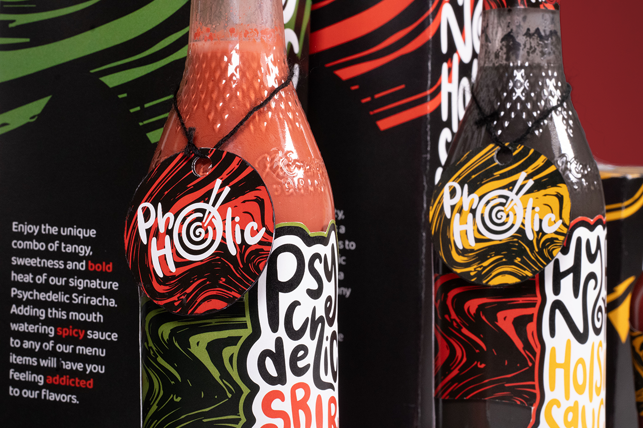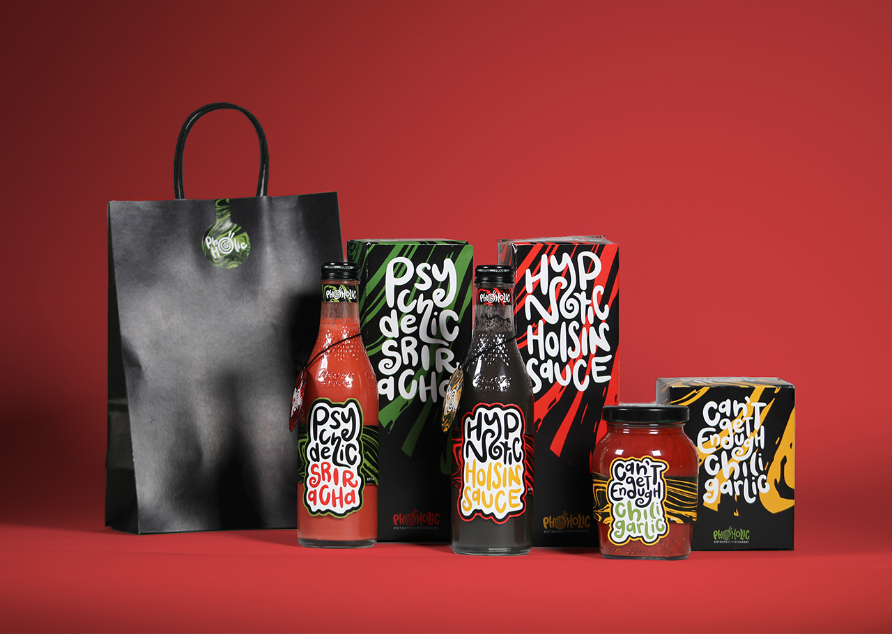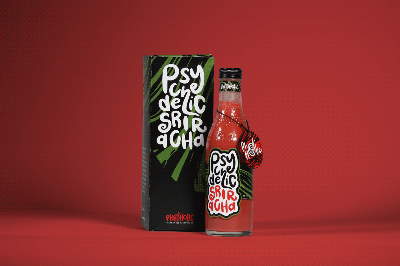 Phoholic is a Vietnamese restaurant located in Westminster, California. The overall look of this packaging system references the feeling of intoxication through its vivid color palette, custom typography, and psychedelic patterns.