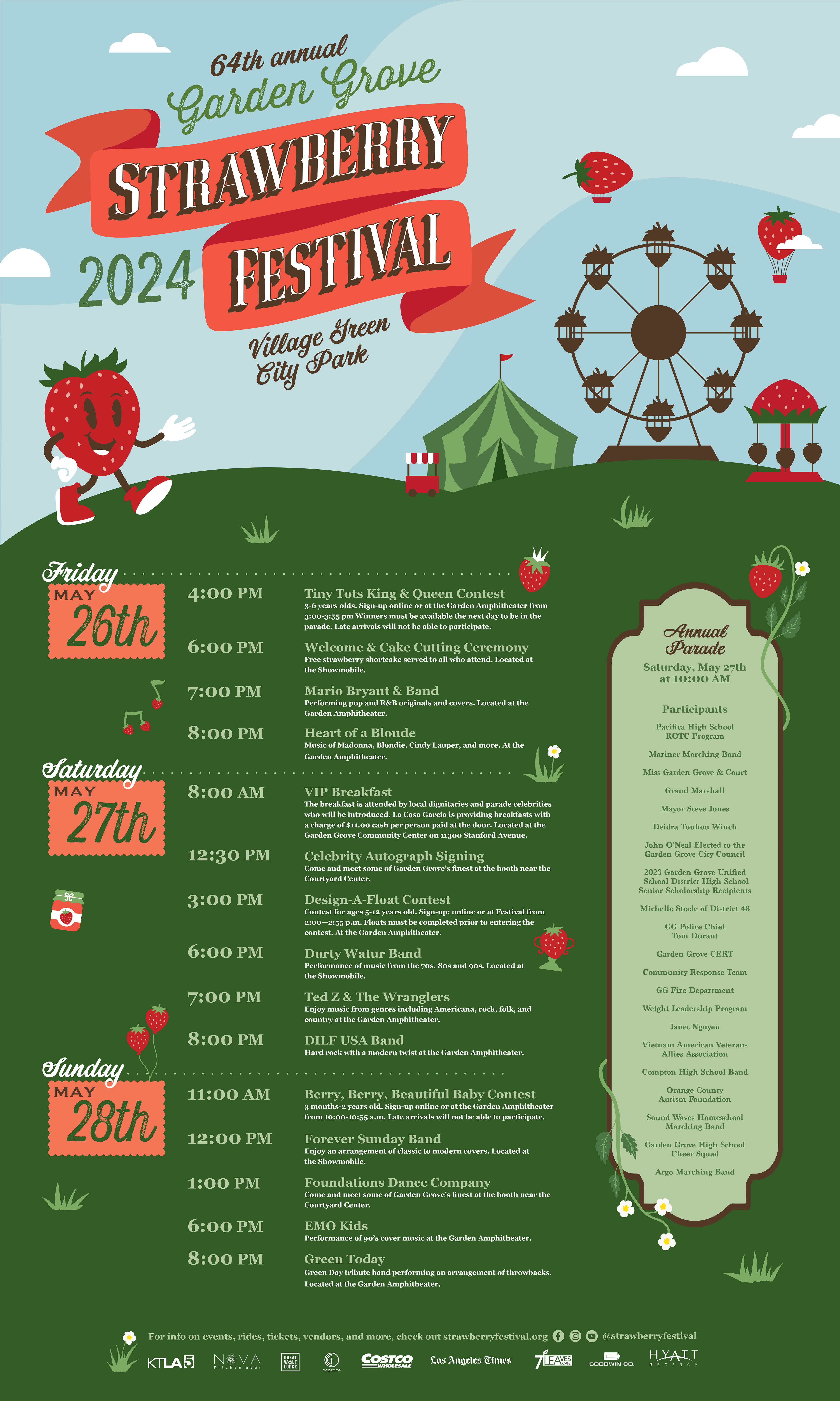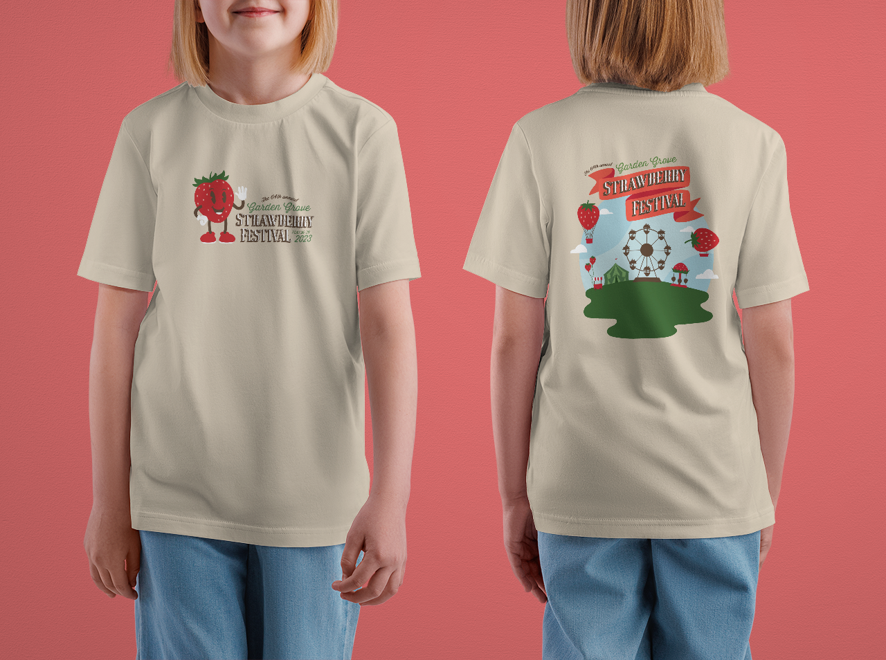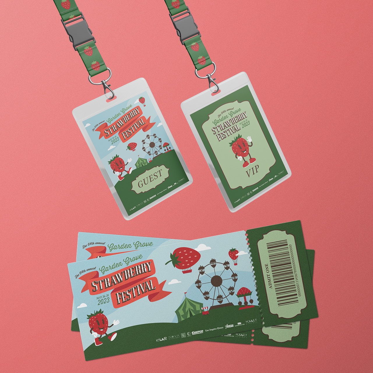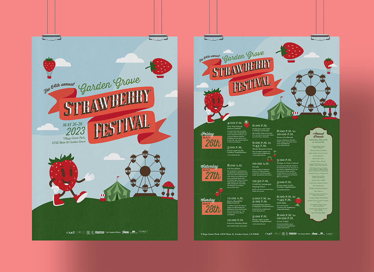 The Garden Grove Strawberry Festival began in 1958 as a community gathering to celebrate the city's bountiful strawberry fields. For this design system, I illustrated a strawberry mascot character amidst a strawberry dreamland that will have young kids begging their parents to take them to this spectacle.