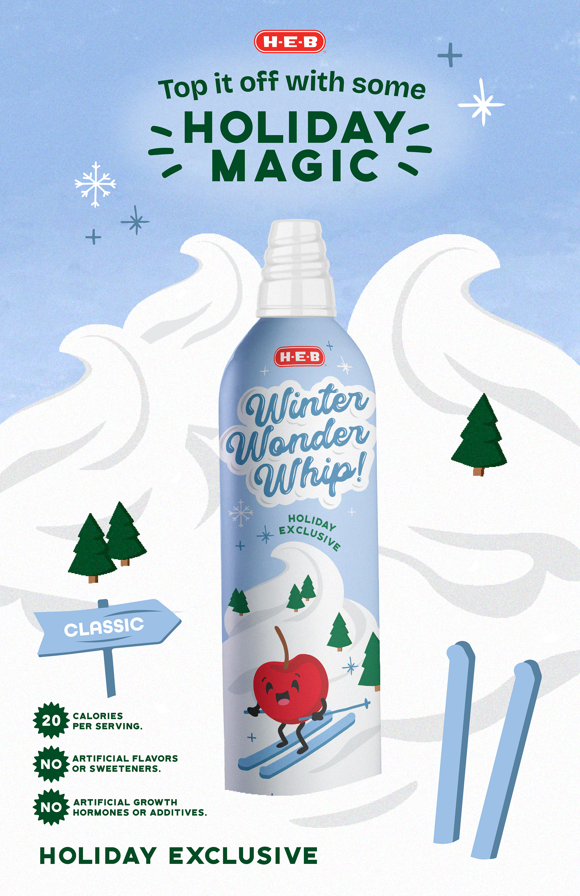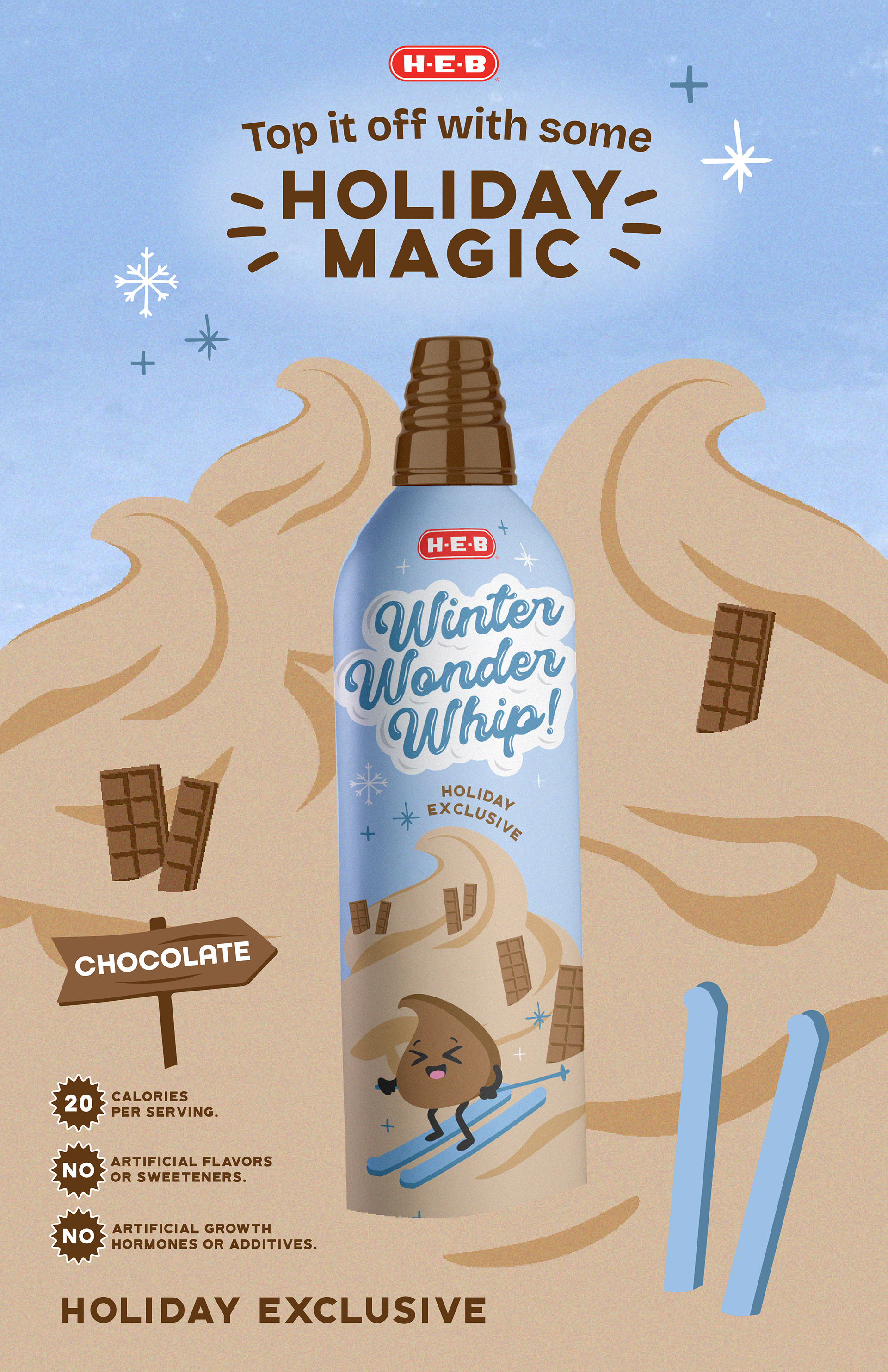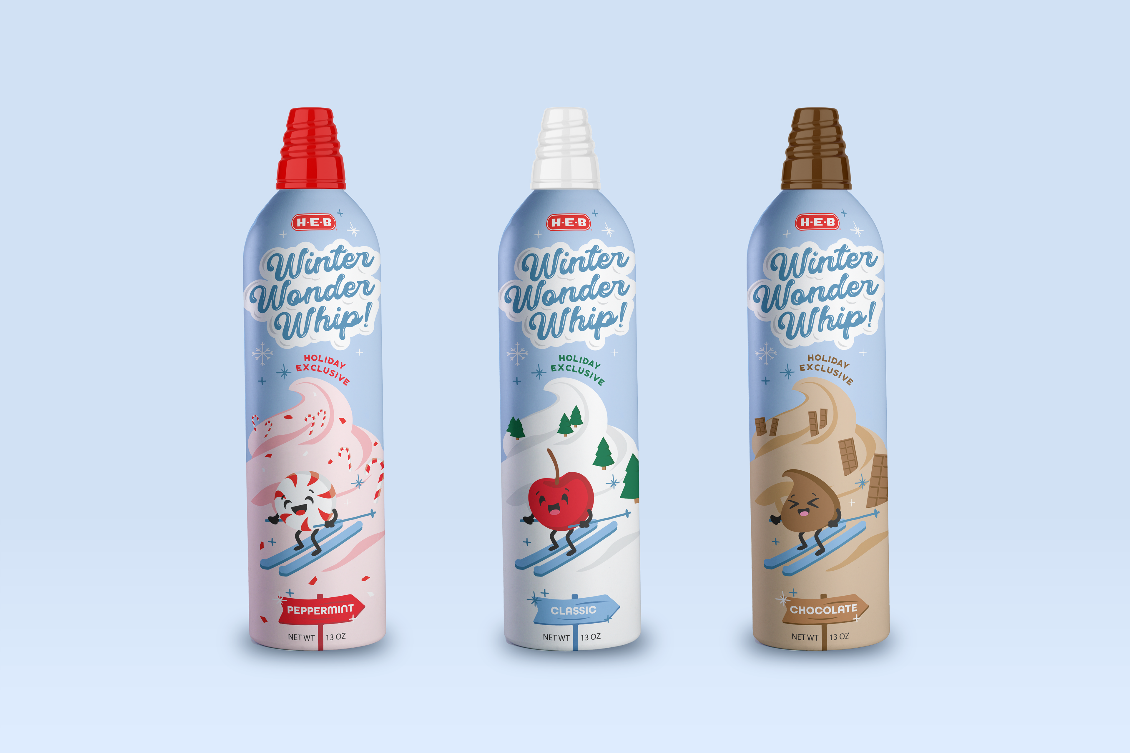H-E-B is a supermarket chain throughout Texas. This project involved designing a set of packaging for a grocery item for H-E-B. I chose whipped cream and created the sub-brand "Winter Wonder Whip" as a holiday-exclusive item to capture the joy and excitement of the holiday season.